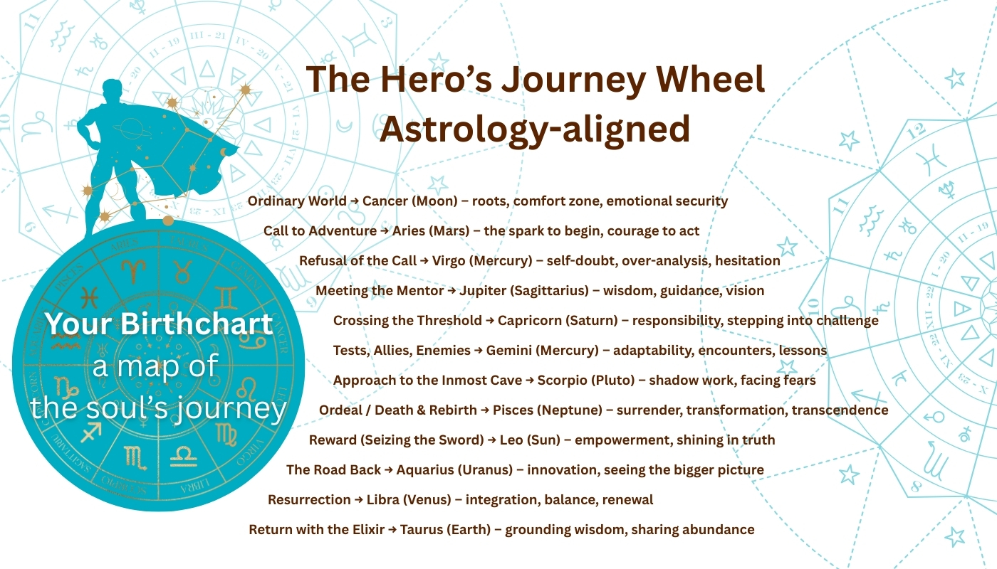 The Hero’s Journey is not just a myth, it is your life unfolding. Astrology gives us the language and symbolism to recognize where we are in the cycle, who our allies are, and what wisdom we are meant to carry.